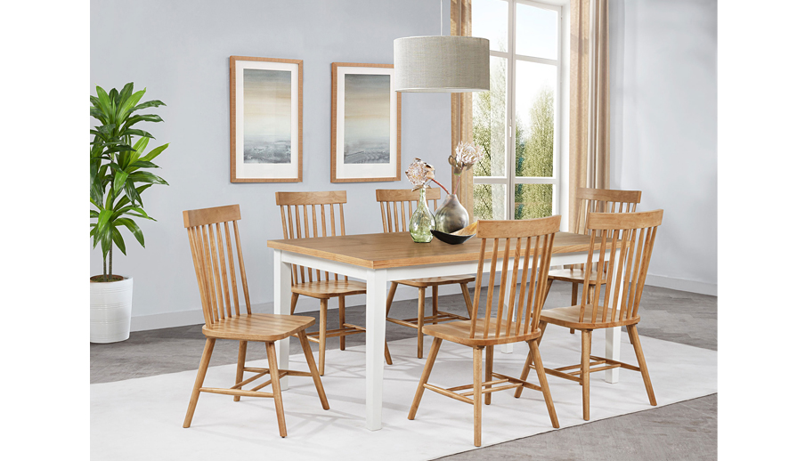 Timeless and inviting, this rectangular dining table pairs warm wood grain with soft white tones for a refreshing farmhouse feel. A spacious top in light ash finish rests on gently tapered white legs, creating a charming two-tone silhouette. Crafted from solid rubberwood with ash veneer over engineered wood, it offers strength and style in equal measure. Perfect for kitchen breakfasts, family dinners, or laid-back gatherings with friends.
