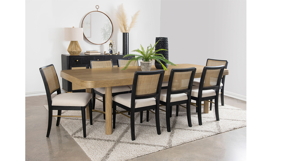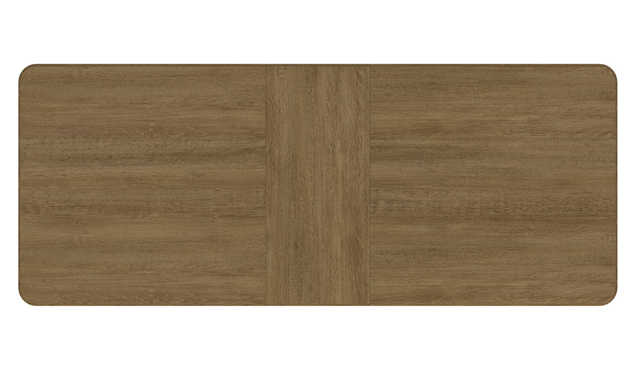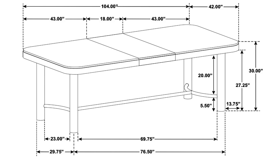 This dining table blends modern refinement with functional design, featuring a trestle base with a metal stretcher bar that adds a contemporary industrial touch. The rounded corners soften the clean lines of the rectangular tabletop, creating a welcoming aesthetic. A removable 18-inch leaf extends the seating capacity, while smooth equalizing metal cable glides ensure effortless, single-person operation. Crafted from solid rubberwood, white ash veneer, and metal, this table offers durability and style for any dining space.
