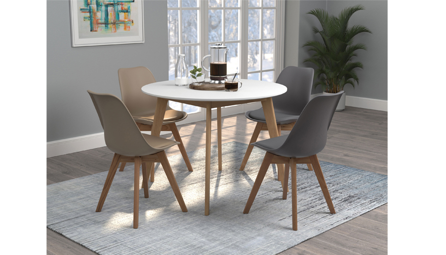 Update a dining nook with a tasteful, two-tone design. With an eye-catching blend of white and natural wood, this round dining table really stands out. Bold, angled legs add mid-century modern flair. The round, white surface adds an extra dimension of style. Crafted of top quality metal and solid wood, this classic table provides years of lasting enjoyment.