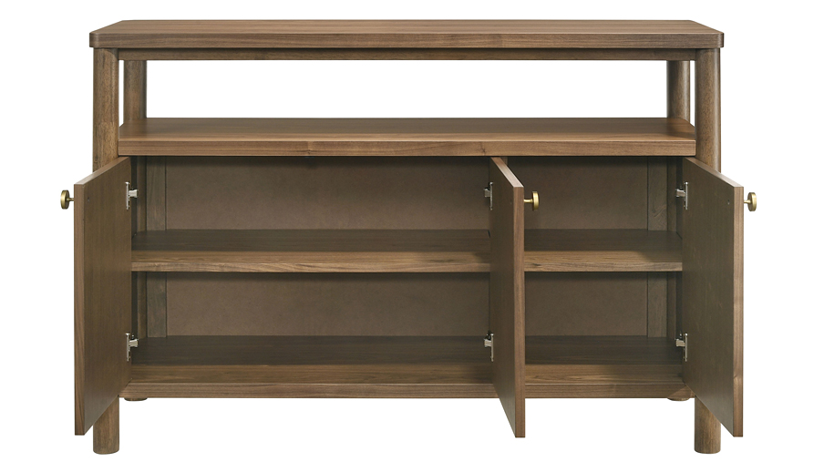 Add easy style and ample storage to your dining room with a modern wooden sideboard with three doors. An open shelf adds easy display space beneath the tabletop, perfect for seasonal accessories that enhance a personalized look and feel. The sideboard features a walnut finish that highlights the wood grain details of its surfaces. Round post legs add a hint of movement to the piece, while three doors open to reveal adjustable shelves for easy storage and organization. Its wide top is ideal for serving delicious meals or showcasing decor.