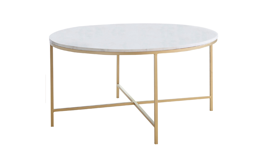 This round coffee table features a genuine white marble top, adding a sophisticated touch to any living room. The elegant marble surface is supported by a welded iron frame with a luxurious gold finish. Fully assembled and ready for use, this cocktail table requires no additional setup, offering convenience and style. Ideal for modern and contemporary interiors, it blends durable construction with premium materials.