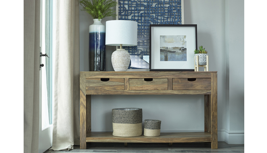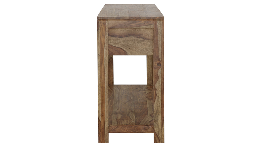 Elevate your space with the timeless beauty of this solid sheesham wood console table. Showcasing natural wood grain accents, this piece exudes rustic charm while offering practical storage. Three slide-out drawers with wooden glides provide easy access to essentials, while the spacious lower shelf is perfect for displaying décor or keeping items organized. Designed for durability and versatility, this console table is an ideal addition to entryways, living rooms, or hallways, bringing warmth and character to any setting.