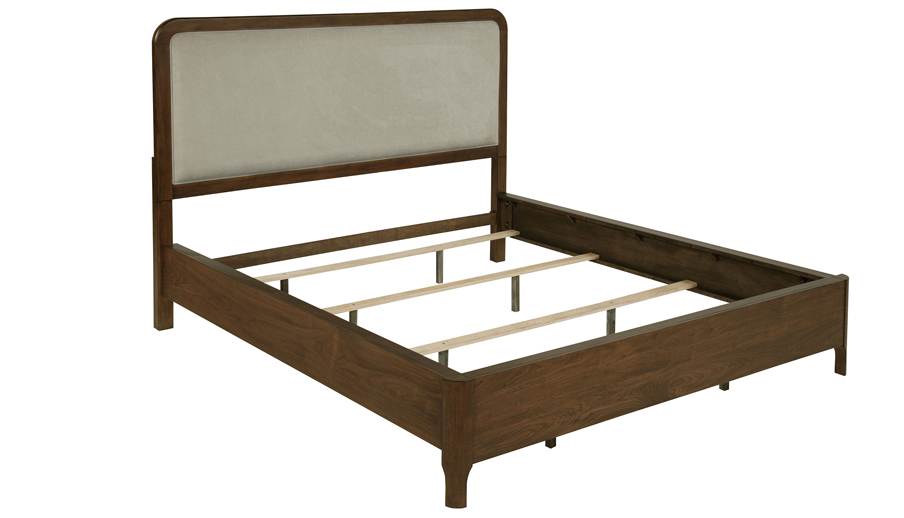 Center your bedroom retreat on the understated style of this transitional bed with an upholstered headboard. It's a refined choice that pairs wooden construction with walnut veneer, creating the perfect dose of warmth and character. The bed boasts a rounded corner headboard, complete with padding and taupe upholstery for both comfort and style. The bed is defined with a clean-lined silhouette, complete with a footboard level with its rails, delivering airy, open ambiance. Choose the perfect linens to create the bedroom of your dreams.